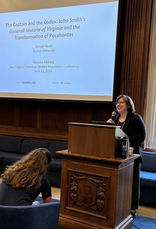 Rachel Kirby introducing keynote speaker Joseph Rezek at the 2024 NEASA conference.